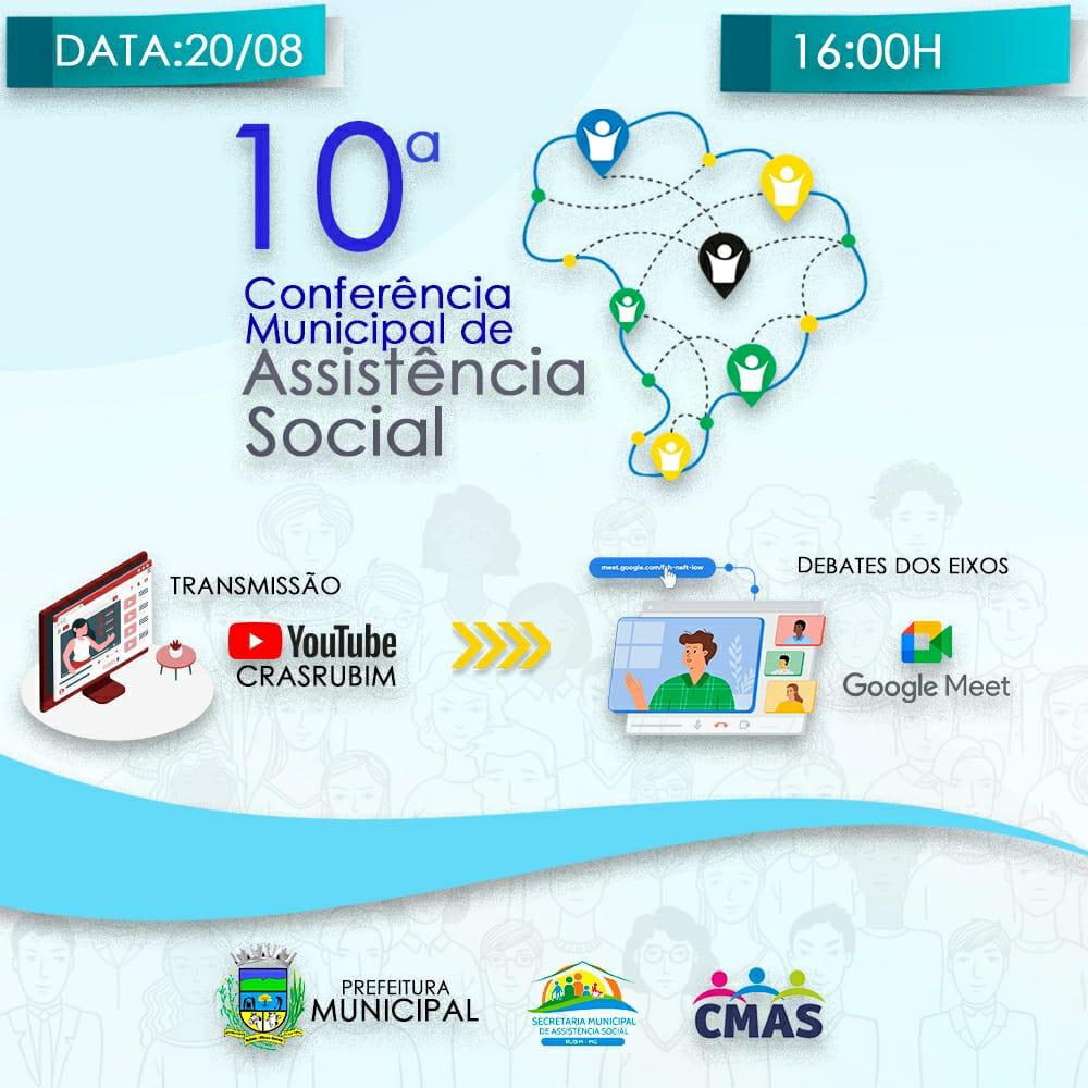A 10ª Conferência Municipal de Assistência Social de Rubim ocorrerá no dia 20 de agosto as 16h em modalidade Online. A transmissão será feita pelo canal CRAS RUBIM no YouTube. Os participantes previamente inscritos participarão de salas virtuais no Google Meet, com direito a voz e voto. Participe.