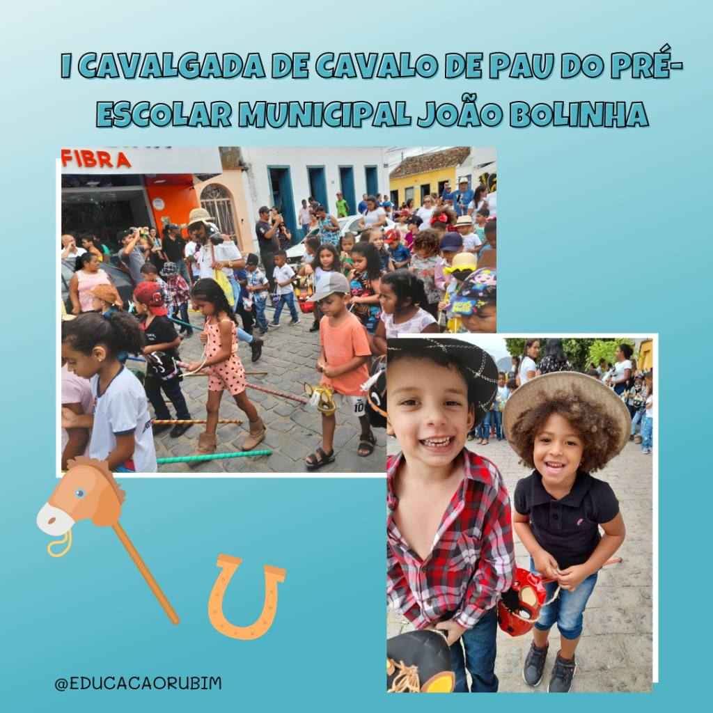 A culminância do projeto se deu de forma recreativa, onde foi realizada uma apresentação nas ruas da cidade, com a “1ª CAVALGADA DE CAVALO DE PAU”. Cada aluno apresentou com seu cavalo de pau, caracterizado ou não com trajes country e cada turma com as suas respectivas comitivas. Foi um evento bonito e gratificante, segundo relatos dos moradores e pais de alunos presentes no evento. Agradecemos a Prefeitura Municipal de Rubim e a Secretaria Municipal de Educação pelo apoio, empenho e disponibilidade em nos atender, para que o evento fosse concretizado. Nossos agradecimentos também a comunidade, pais, responsáveis e todos os funcionários do Pré-Escolar Municipal João Bolinha.