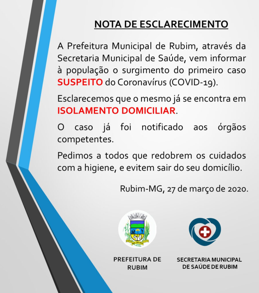 A Prefeitura Municipal de Rubim, através da Secretaria Municipal de Saúde, vem informar à população o surgimento do primeiro caso SUSPEITO do Coronavírus (COVID-19).
